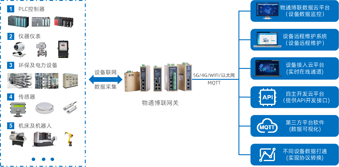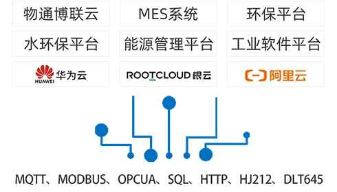 支持顺利获得MQTT、MODBUS、OPCUA、SQL、HTTP数据库等方式接入远端软件平台(包含:yth游艇会yth206云平台,客户自主开发的云平台,根云、美云、华为、阿里、百度、微软等IOT云平台,组态软件、MES系统、ERP系统等工业软件)