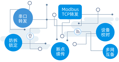 串口转发、Modbus TCP转发、设备校时、防拆锁定、断点续传,多网互备等等