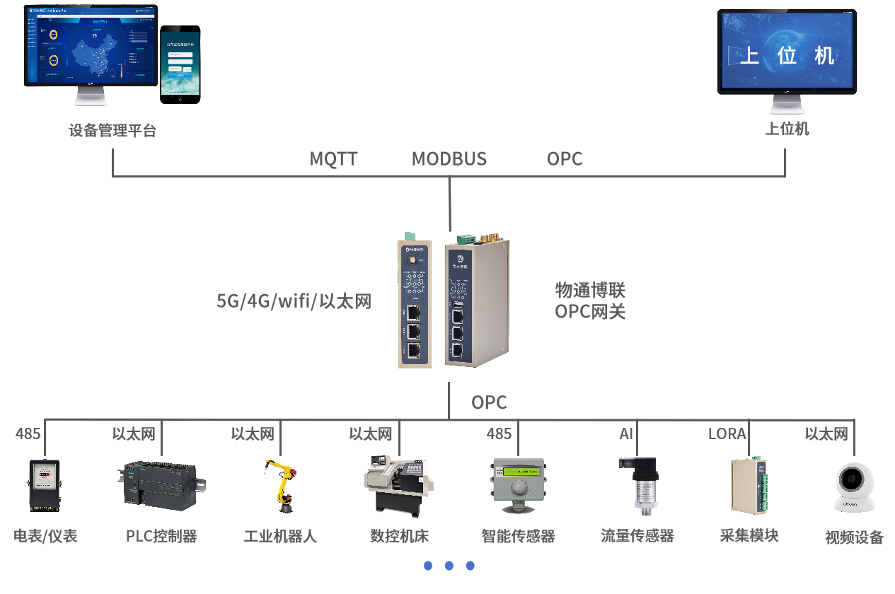 支持采集各种工控设备、DCS、SCADA系统数据,并将数据顺利获得OPC UA协议转发给组态软件、上位机软件、云平台