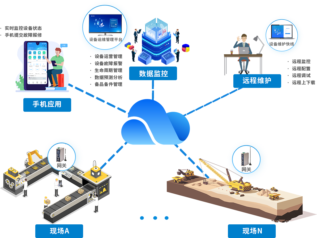 yth游艇会yth206针对设备制造商的装备数字化需求,构建了“终端数据采集-多网融合传输-云端智能运维-远程协同服务”的全周期技术解决方案:以工业智能网关为核心,采集装备运行参数、运行状态等数据,顺利获得 5G/4G/WiFi/ 以太网等方式将标准化数据实时上传至设备运维管理平台。平台借大数据分析与故障诊断算法,实现数据监控、趋势预测与异常识别,设备存故障风险时自动触发预警。依托设备维护快线,可远程完成程序上下载、参数调试等操作,提升维护效率、降低运维成本,助力设备制造商实现装备全生命周期数字化管理。